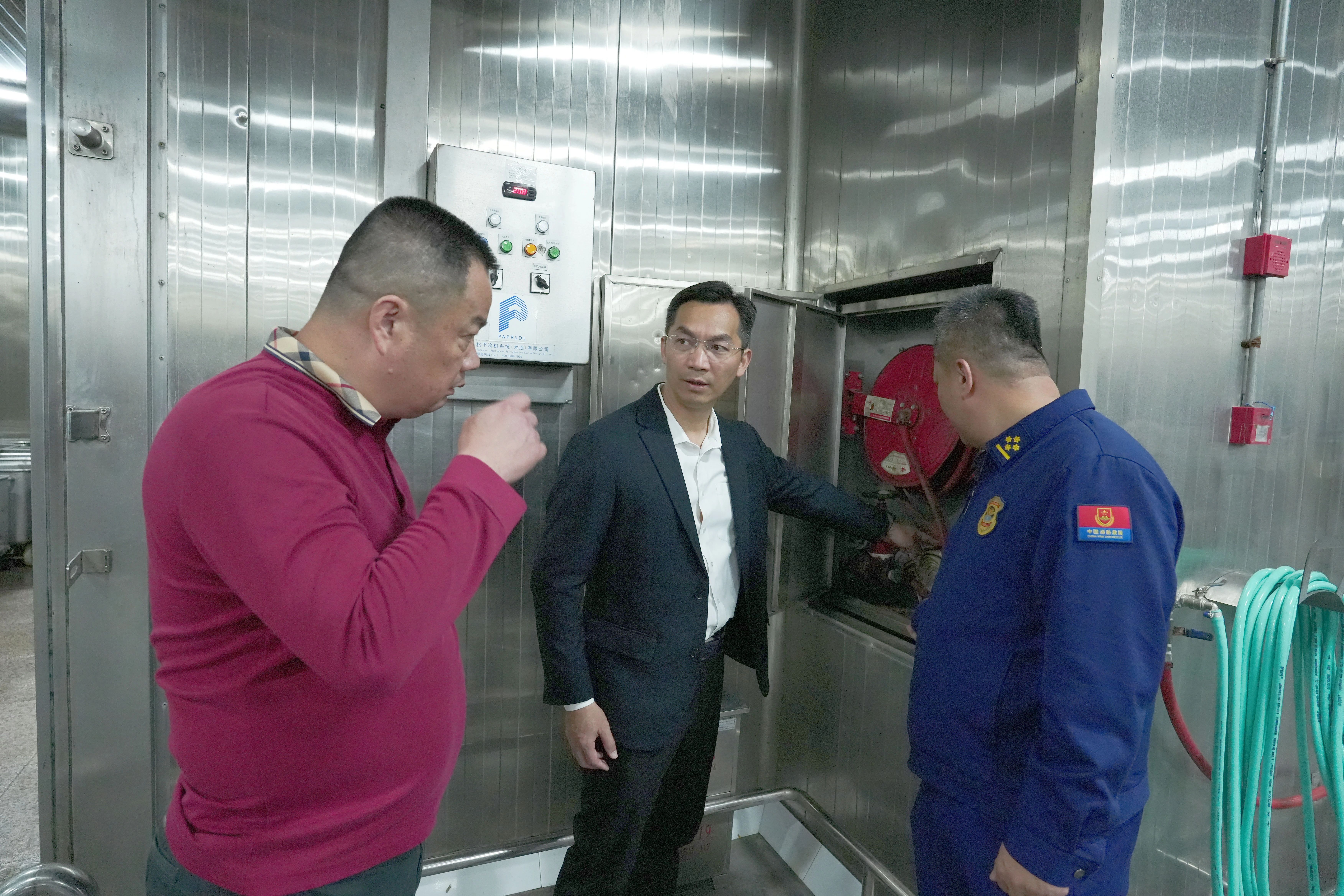 在大型商超,检查组重点查看了消防疏散通道、安全出口是否畅通无阻,消防器材设施是否完好有效,应急照明、指示标志是否清晰规范。针对检查中发现的通道部分区域存在货物临时堆放等问题,冼智前现场要求立即整改。他指出,节假日期间商场人流物流高度集中,安全容不得半点马虎。商场管理方必须切实履行主体责任,彻底清理疏散通道障碍物,科学规划功能区域,保持“生命通道”全天候畅通。要加强客流监控与疏导,完善应急疏散预案,配足安保力量,为消费者营造安全、有序的购物环境。