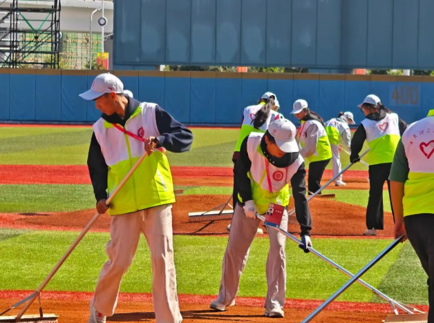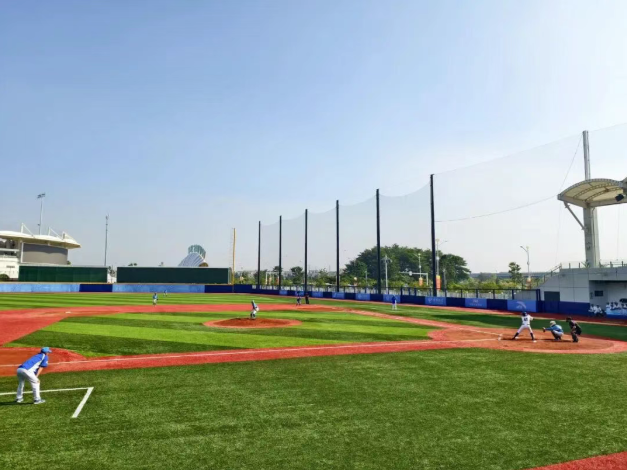 在阳光照耀下,棒球场上红土跑道与翠绿如茵的草皮形成鲜明对比、界线分明;垒球场同样设施一流,场地区域划分科学;运动员更衣室内装备摆放整齐,所需物资一应俱全,细节之处尽显对运动员的关怀……