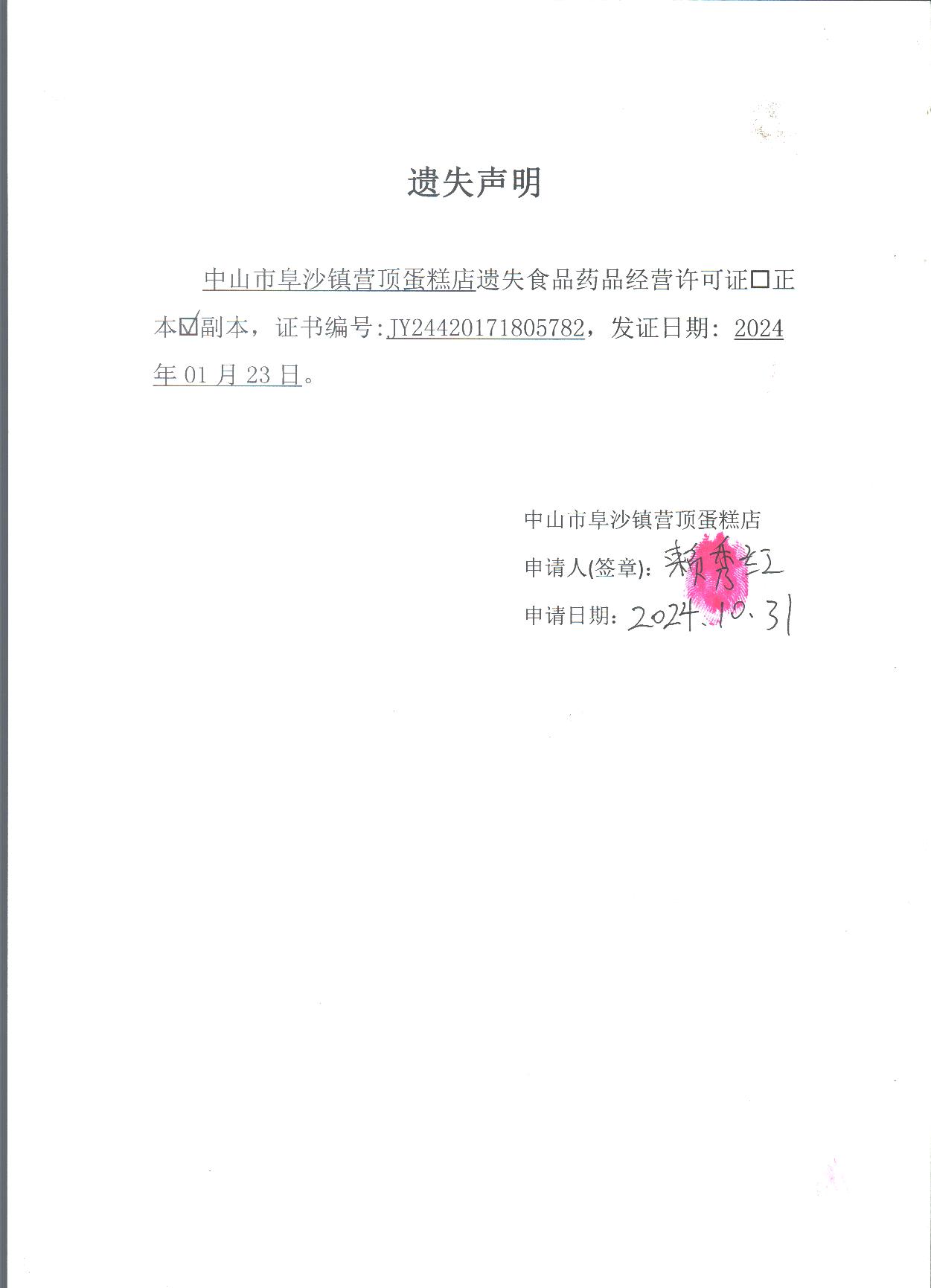 食品药品经营许可证遗失声明(中山市阜沙镇营顶蛋糕店)