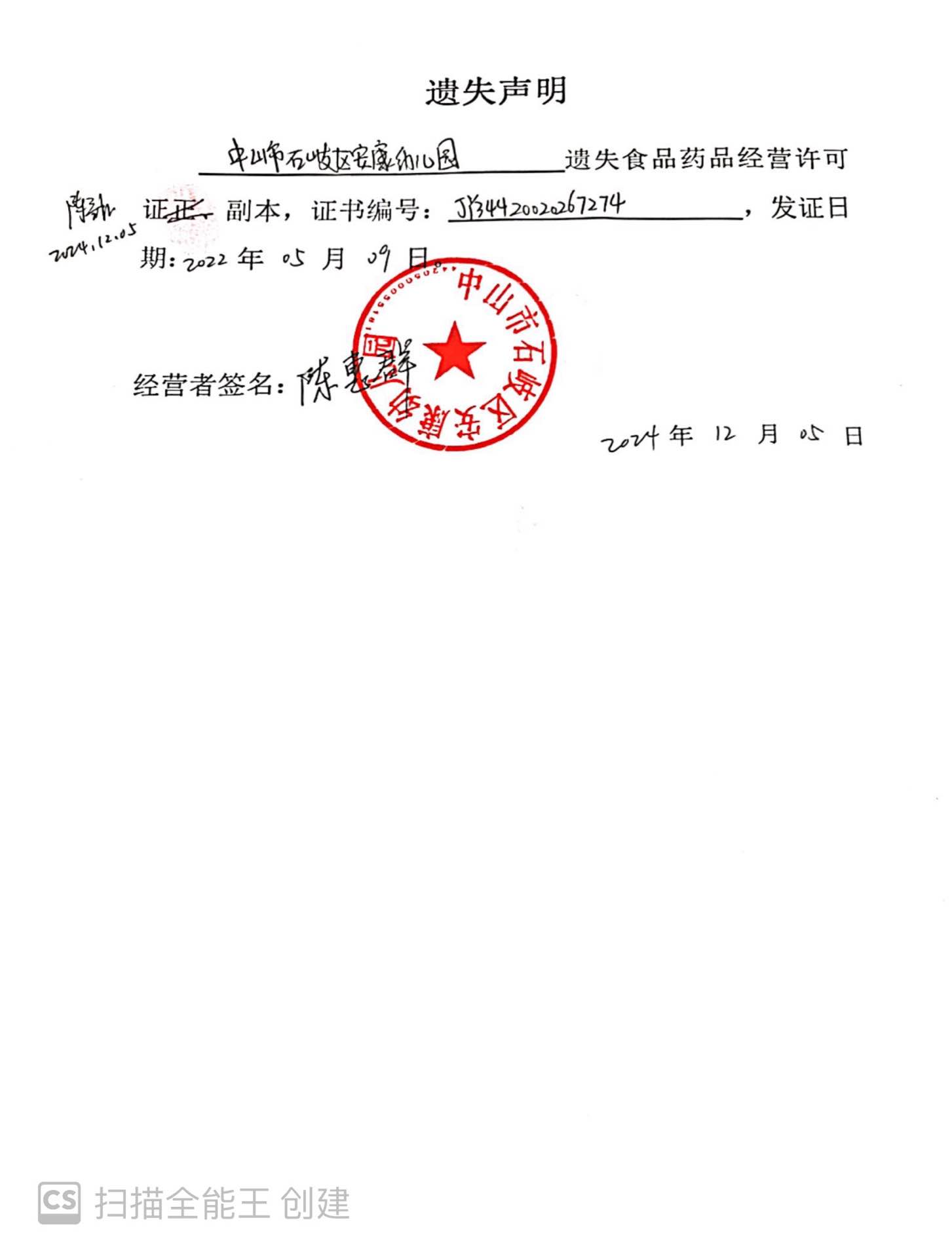 | 名称: | 食品药品经营许可证遗失声明(中山市石岐区安康幼儿园) | ||