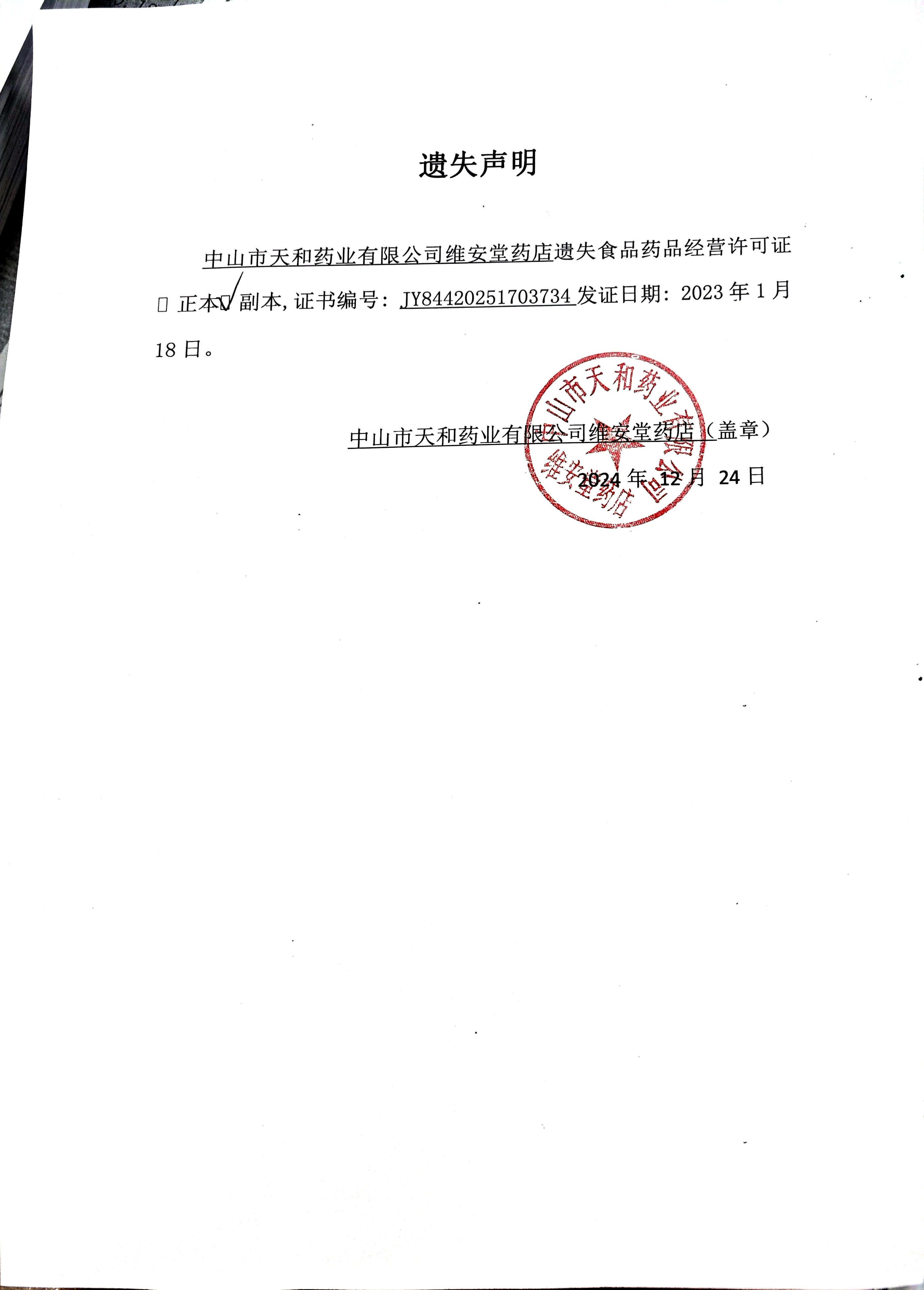 食品药品经营许可证遗失声明(中山市天和药业有限公司维安堂药店)