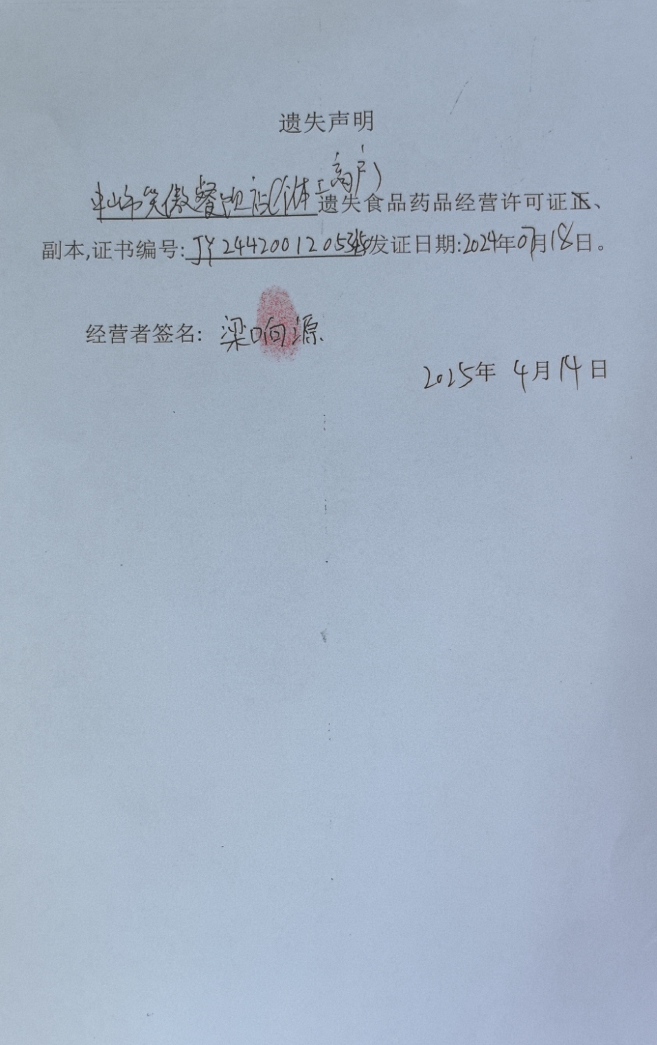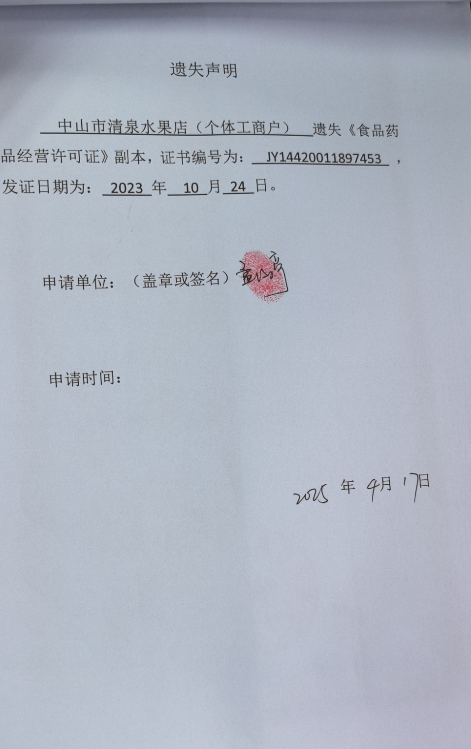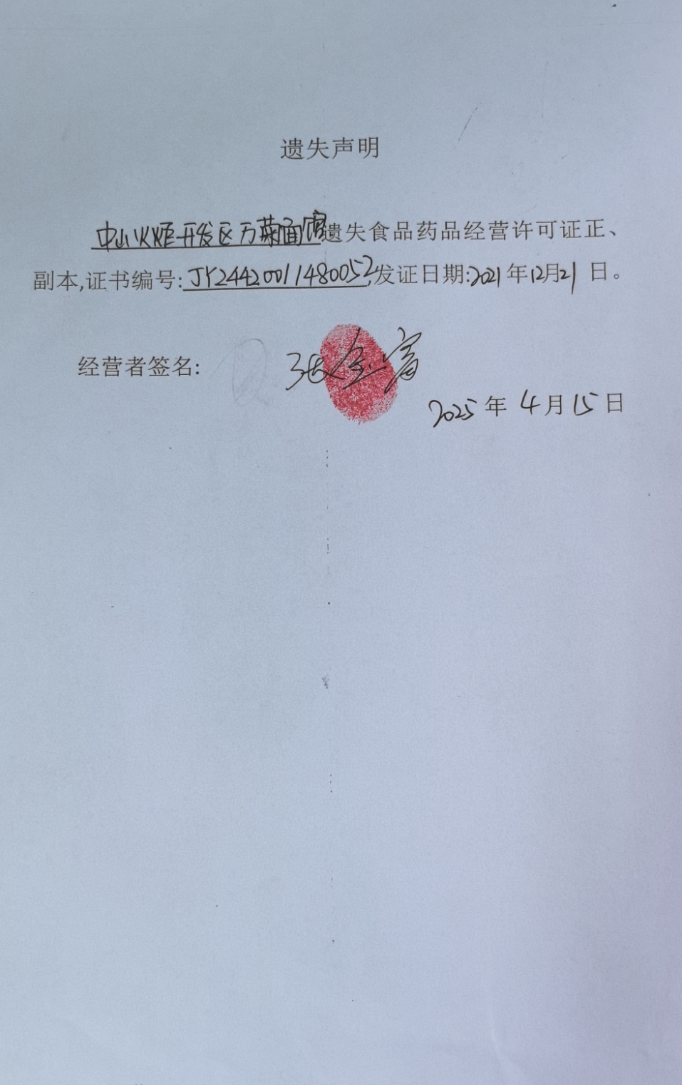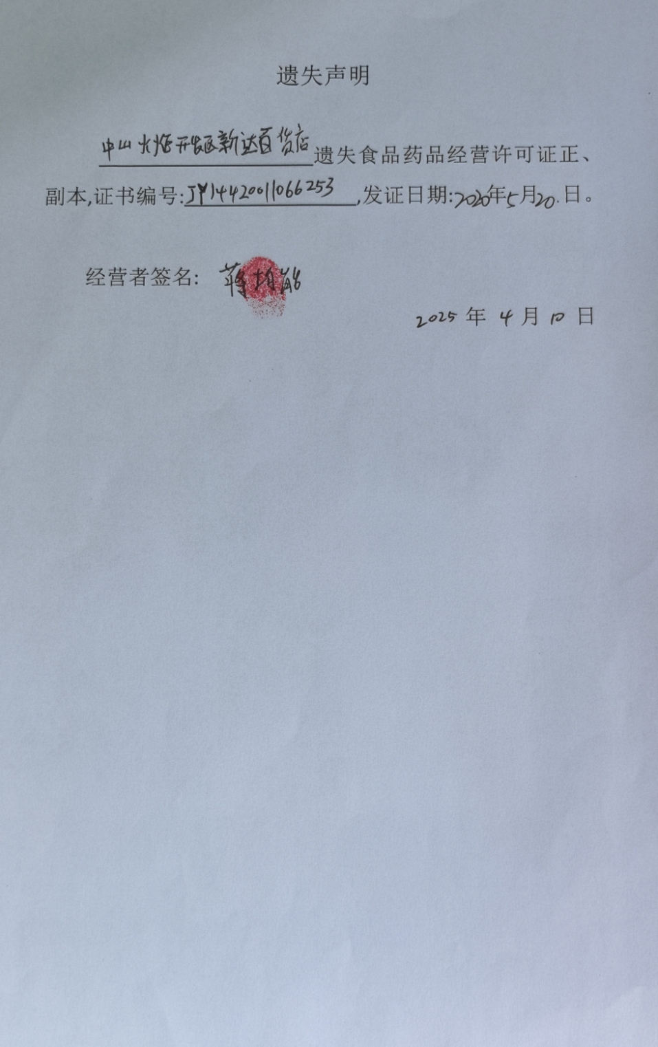 食品药品经营许可证遗失声明【中山火炬开发区新达百货店、中山市笑傲餐饮店(个体工商户)、中山火炬开发区万菊面馆、中山市清泉水果店(个体工商户)】