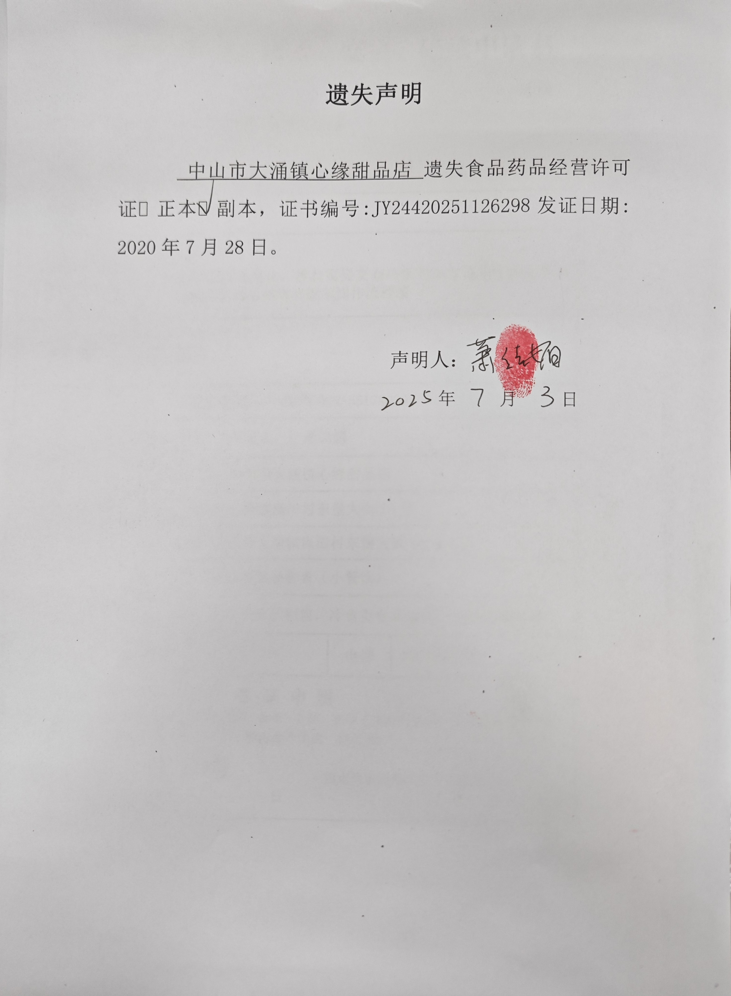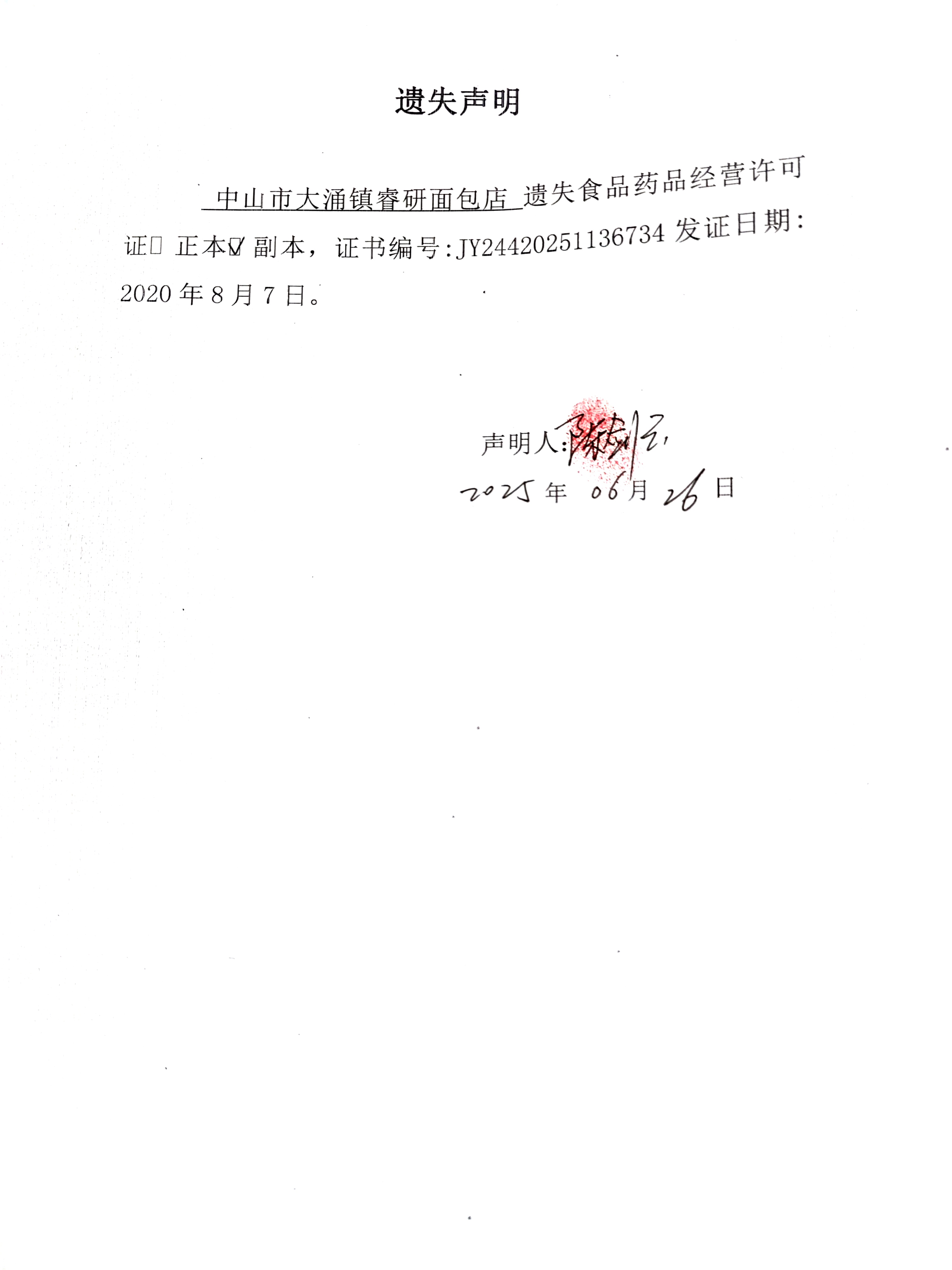 食品药品经营许可证遗失声明(中山市大涌镇睿研面包店、中山市大涌镇心缘甜品店)