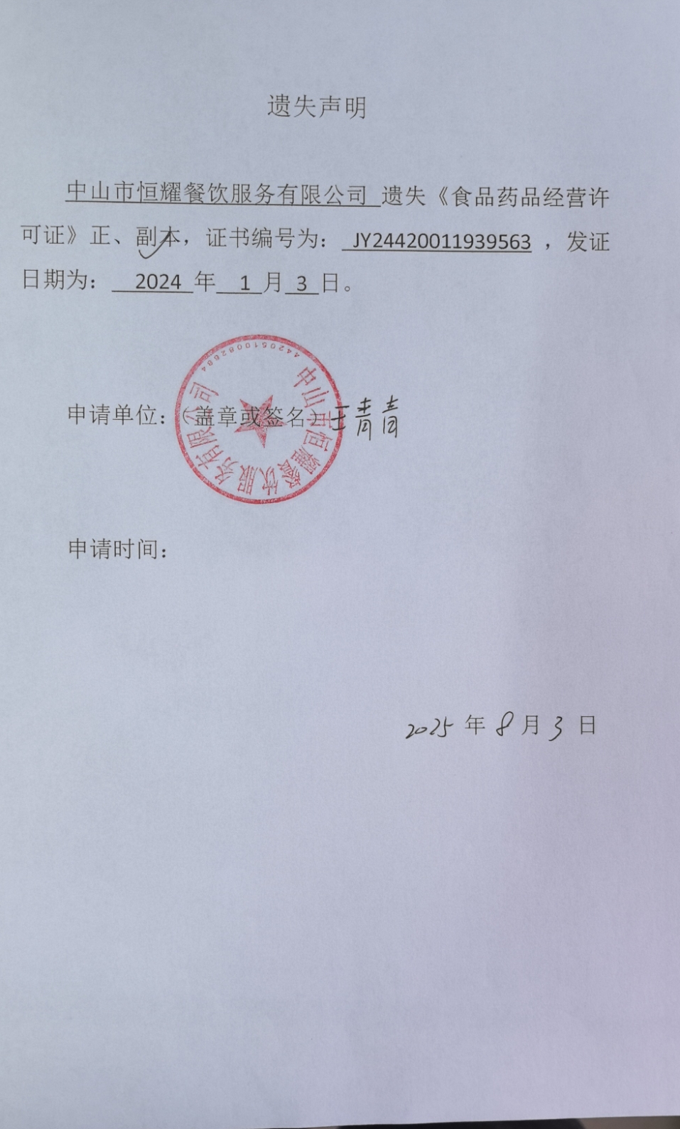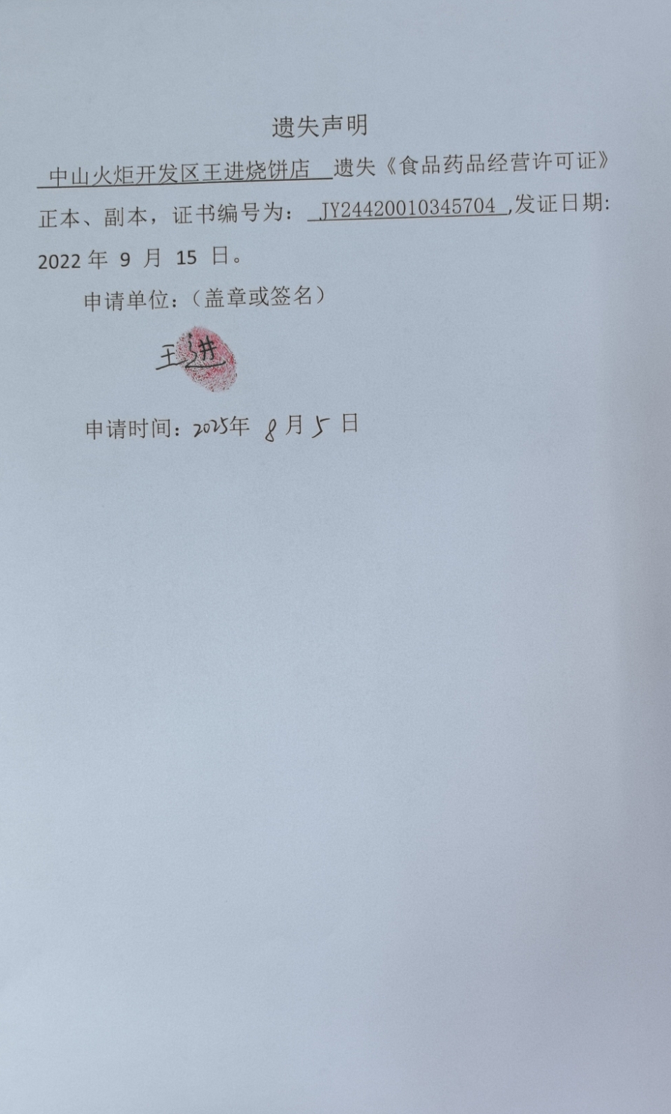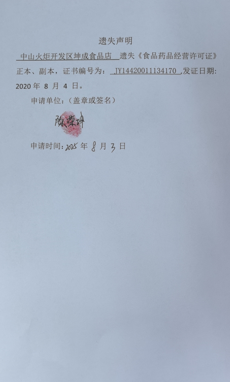 食品药品经营许可证遗失声明(中山火炬开发区坤成食品店、中山火炬开发区王进烧饼店、中山市恒耀餐饮服务有限公司)