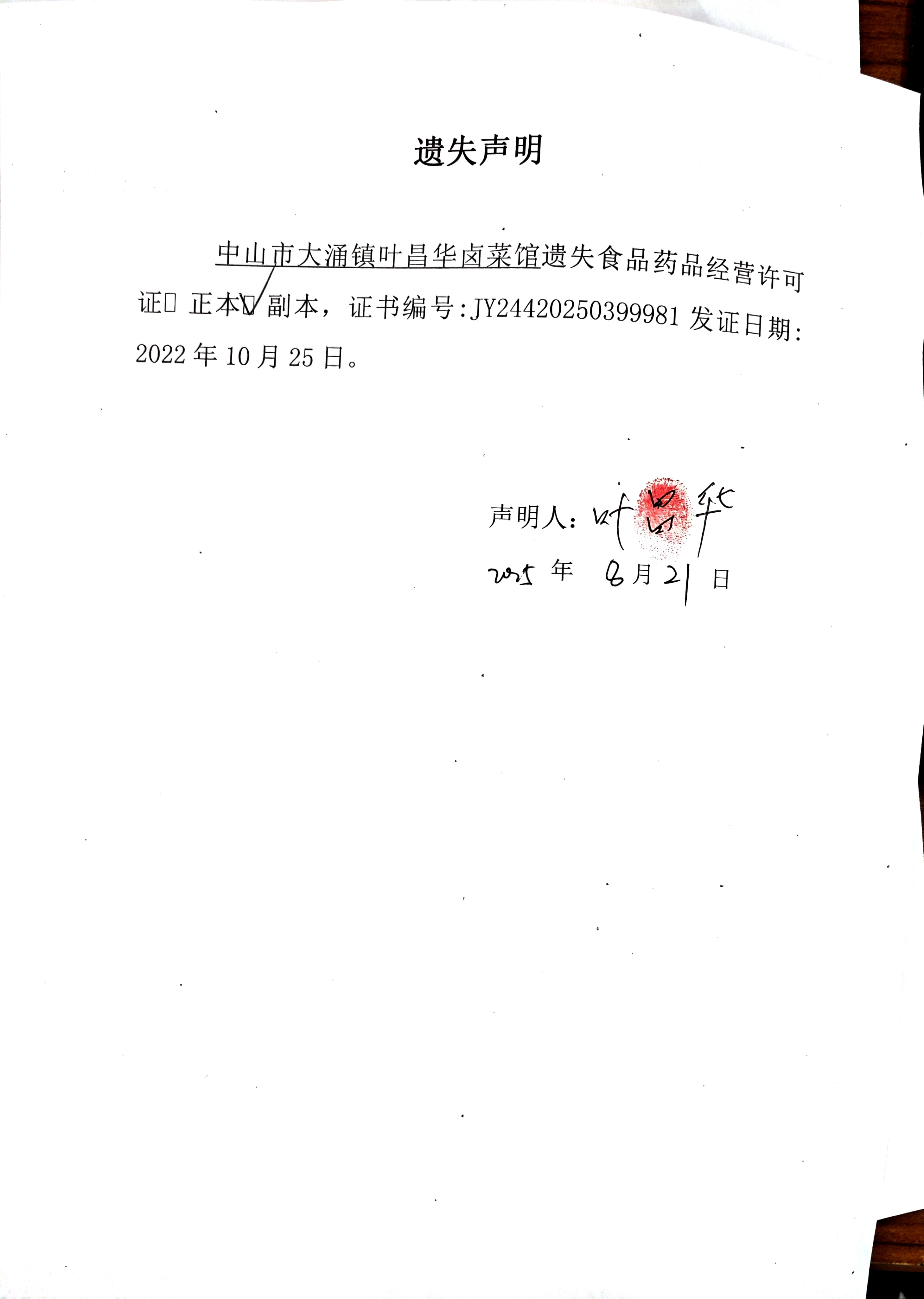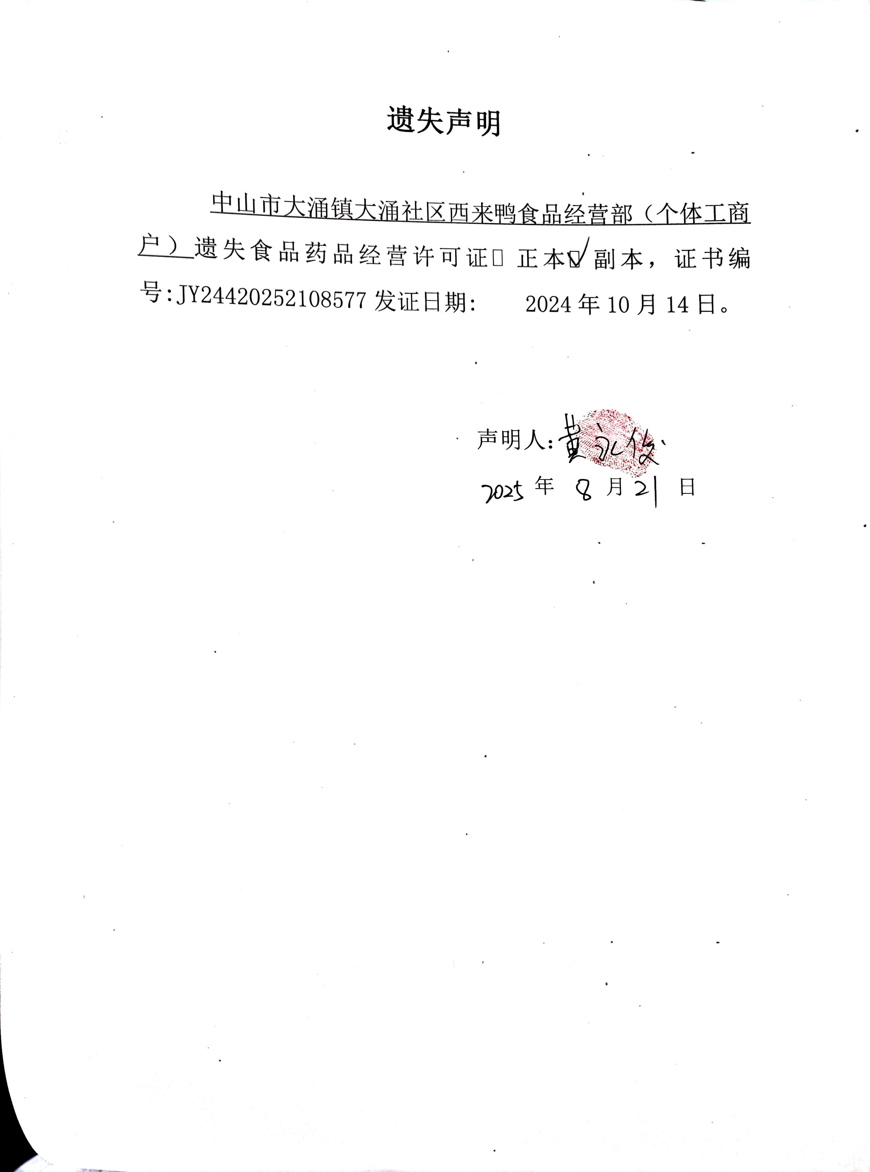 | 名称: | 食品药品经营许可证遗失声明【中山市大涌镇大涌社区西来鸭食品经营部(个体工商户)、中山市大涌镇叶昌华卤菜馆】 | ||