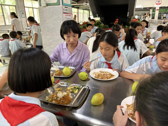 ▲东区街道办事处副主任梁子文检查中山市香山小学食堂并自费陪餐。