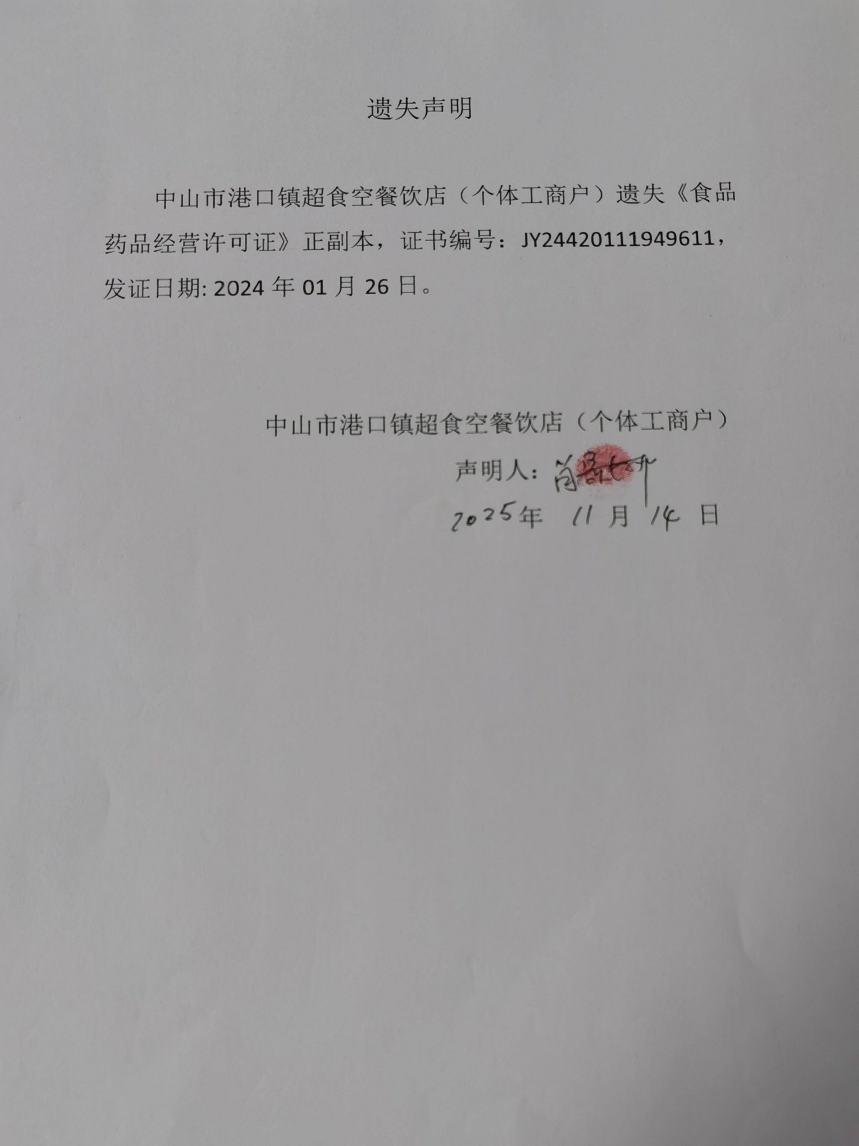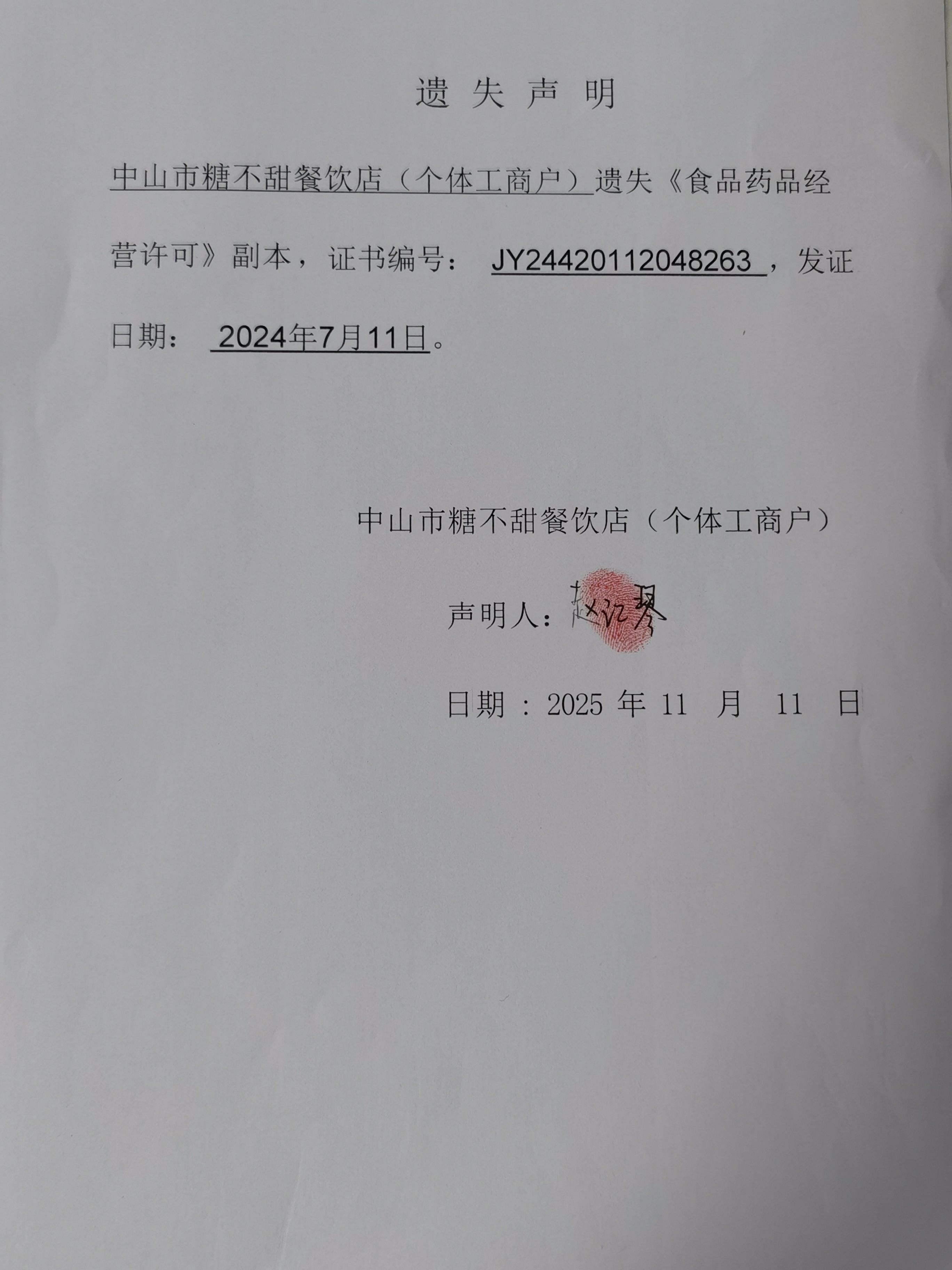 | 名称: | 食品药品经营许可证遗失声明〔中山市糖不甜餐饮店(个体工商户)、中山市港口镇超食空餐饮店(个体工商户)〕 | ||