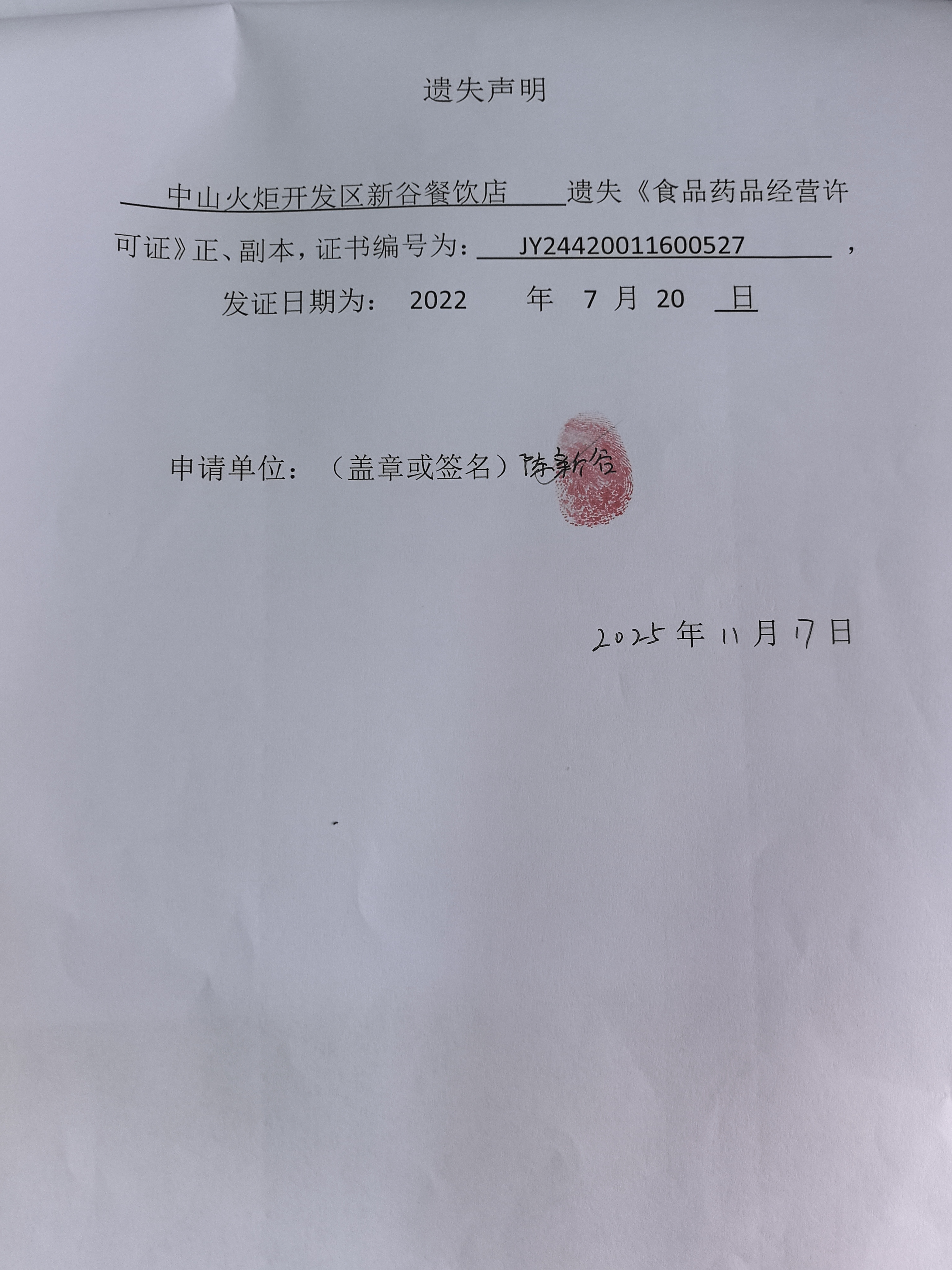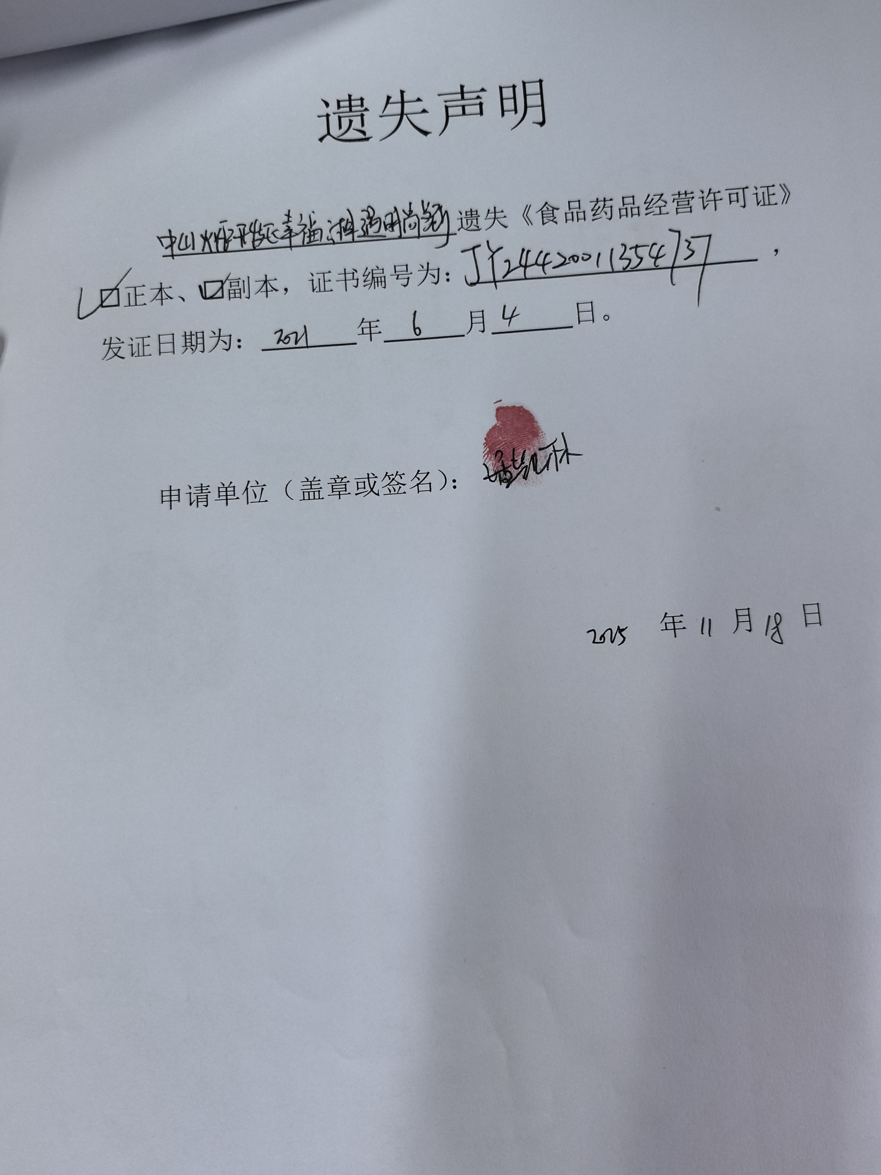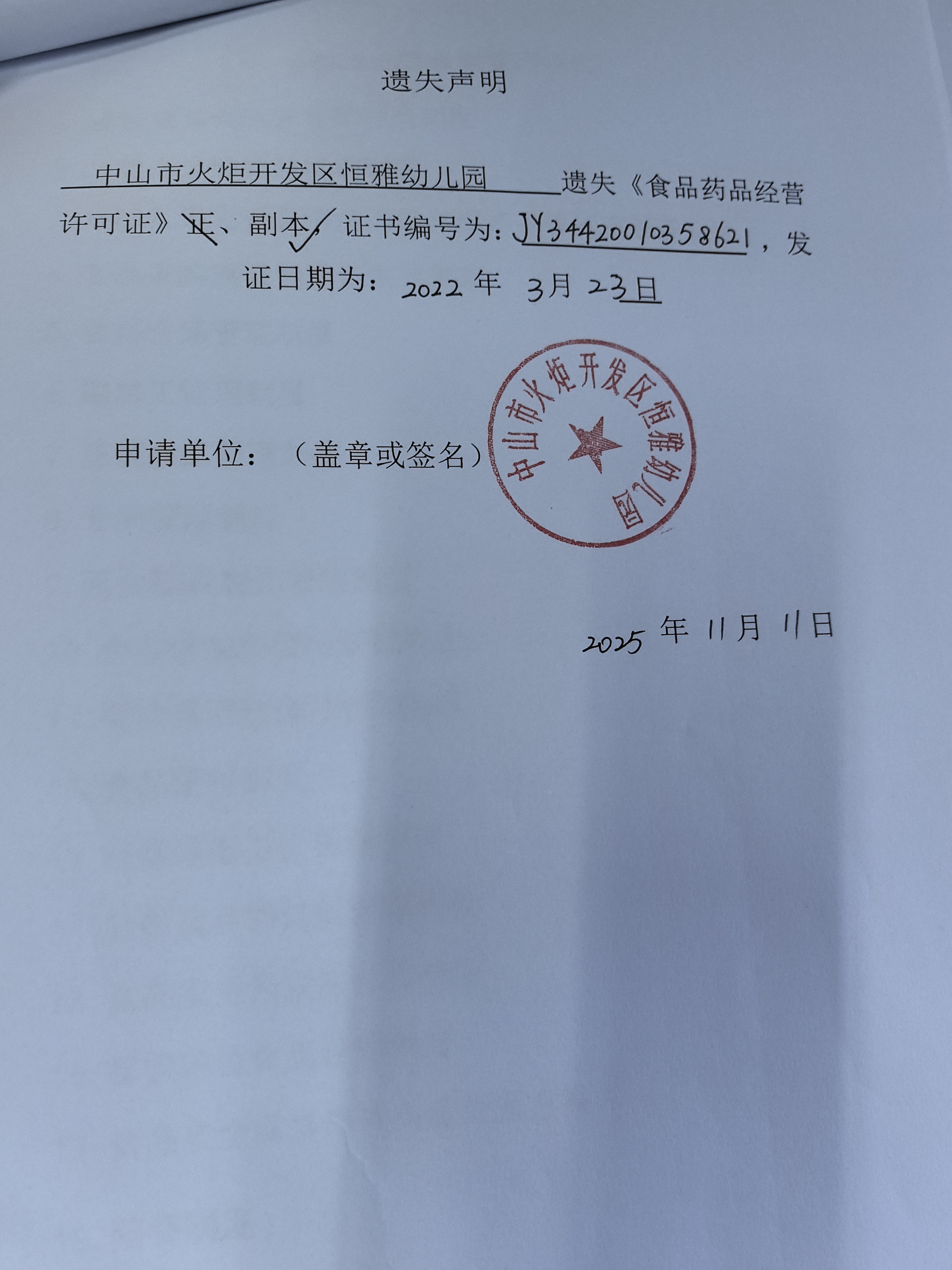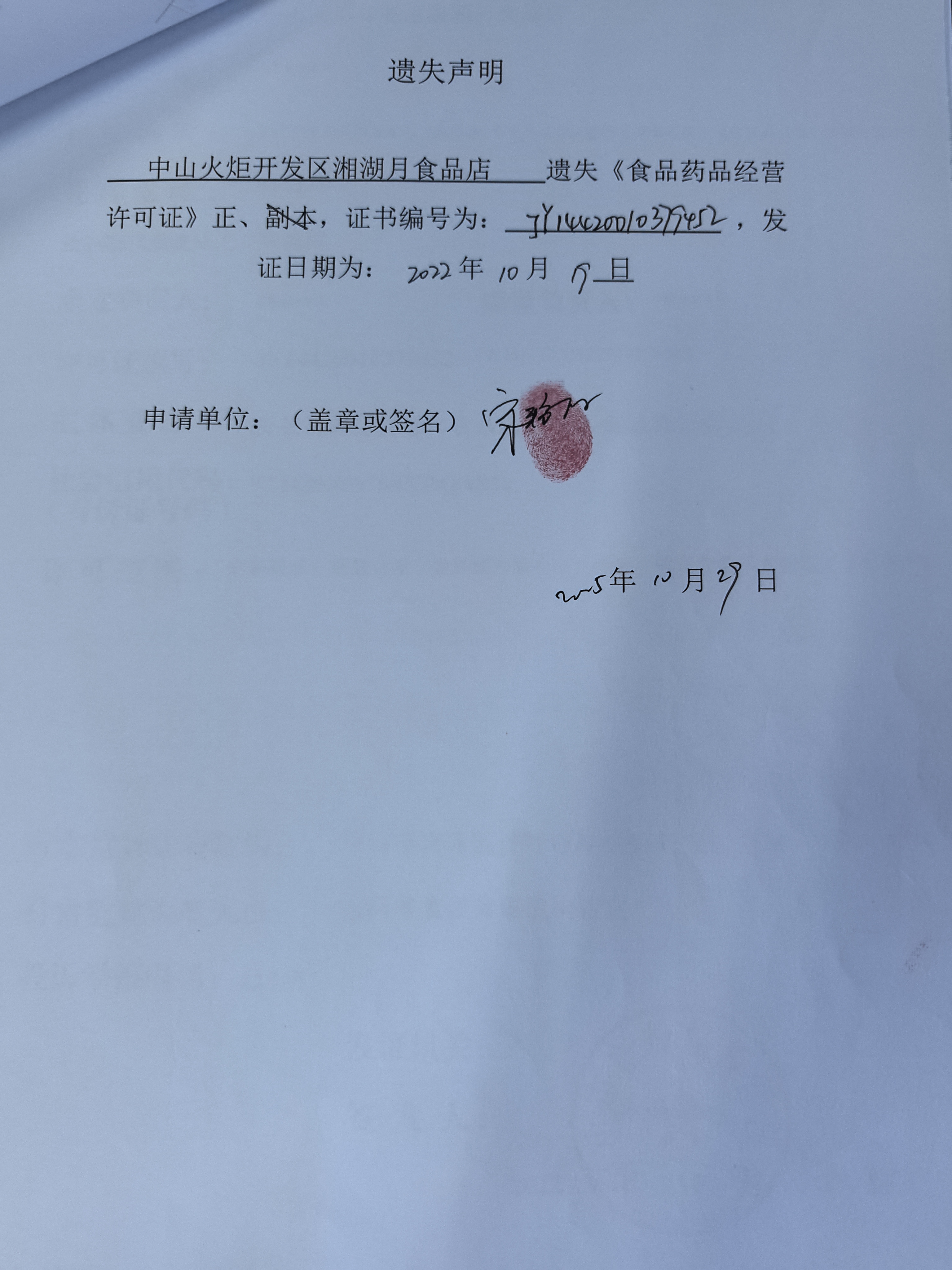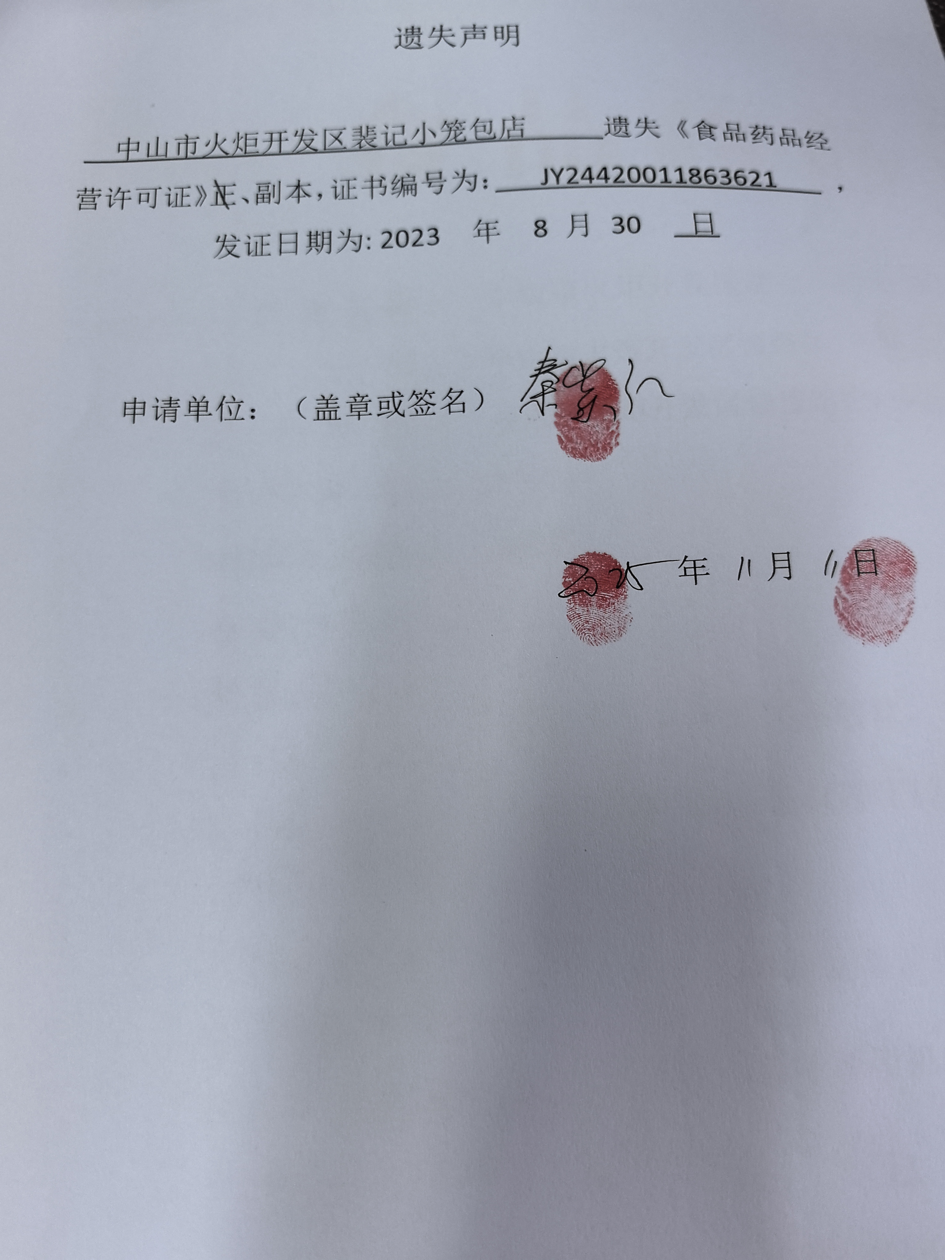 | 名称: | 食品药品经营许可证遗失声明(中山火炬开发区湘湖月食品店、中山火炬开发区新谷餐饮店、中山火炬开发区幸福湘遇时尚餐厅、中山火炬开发区赵平烧腊店、中山市火炬开发区恒雅幼儿园、中山市火炬开发区裴记小笼包店) | ||