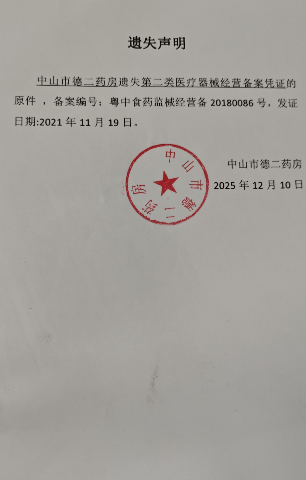 | 名称: | 第二类医疗器械经营备案凭证遗失声明(中山市德二药房) | ||
