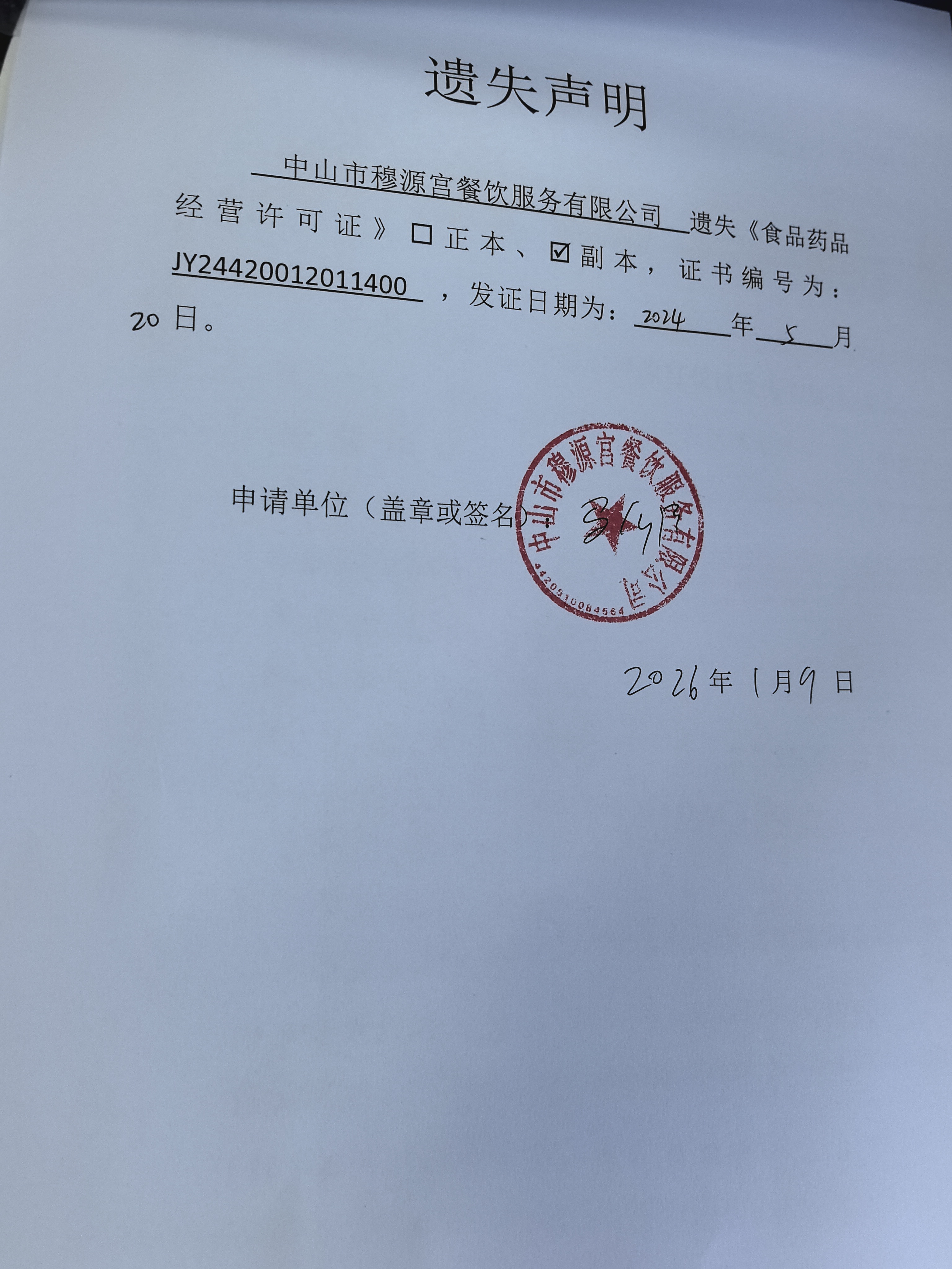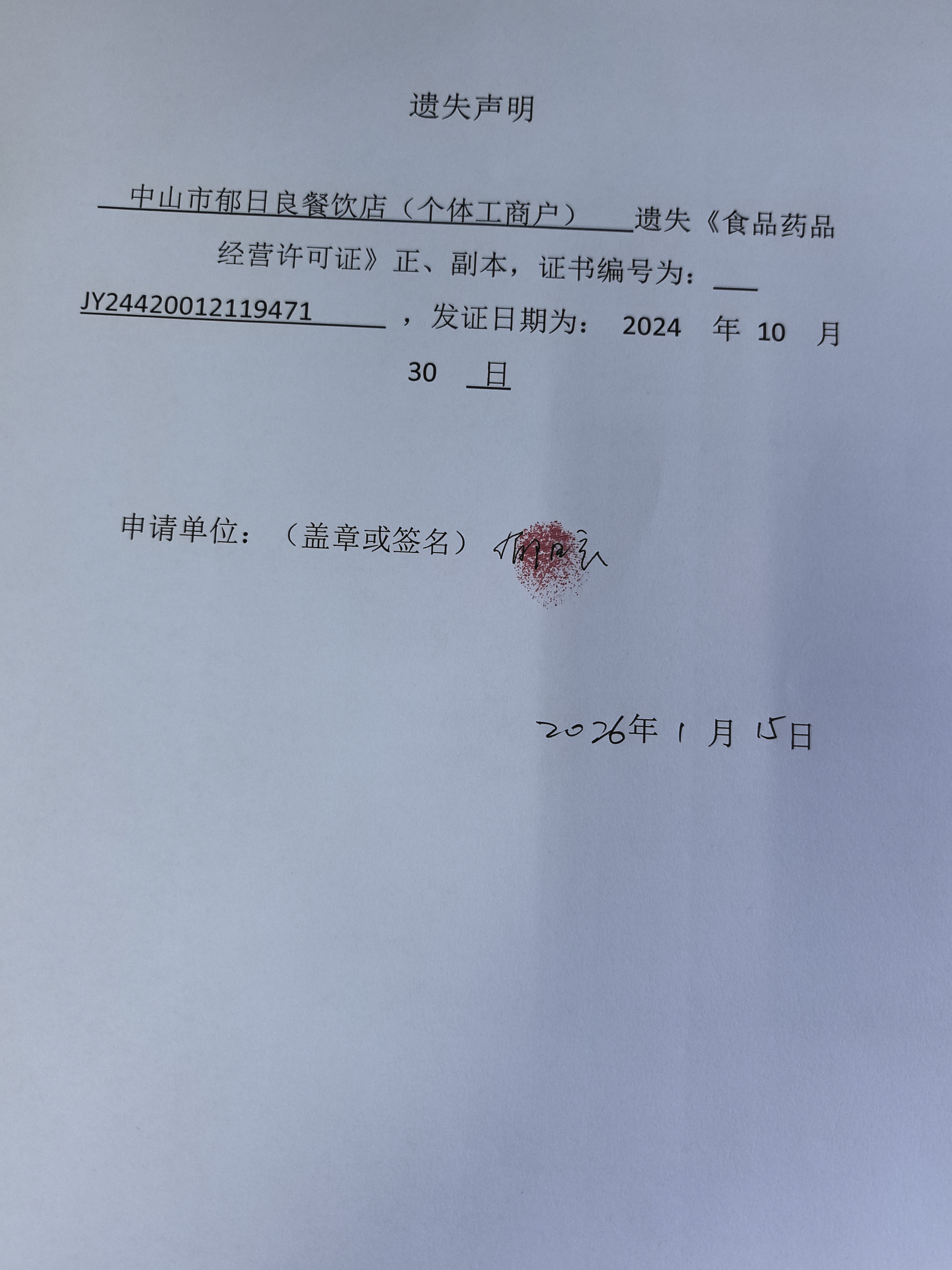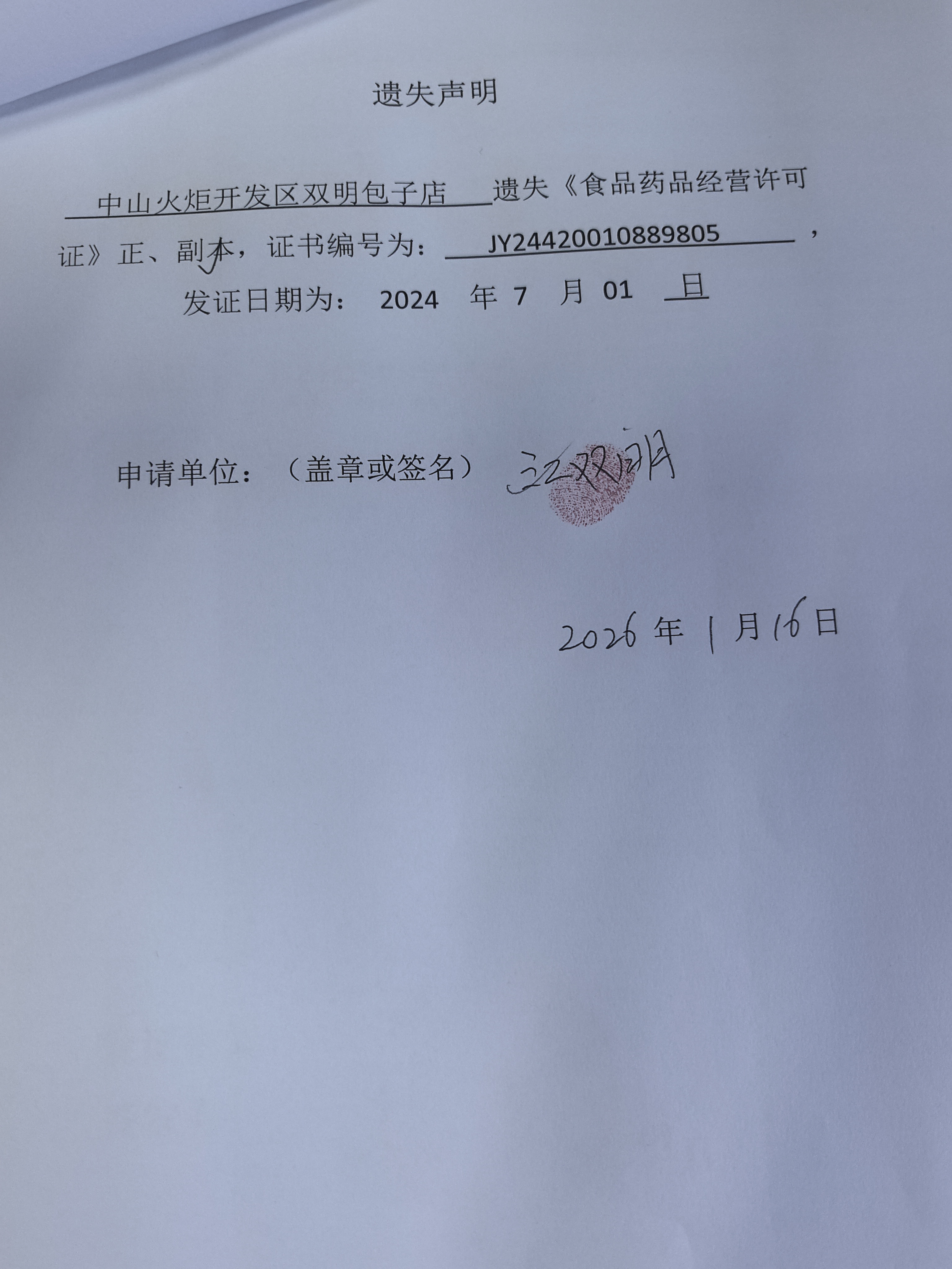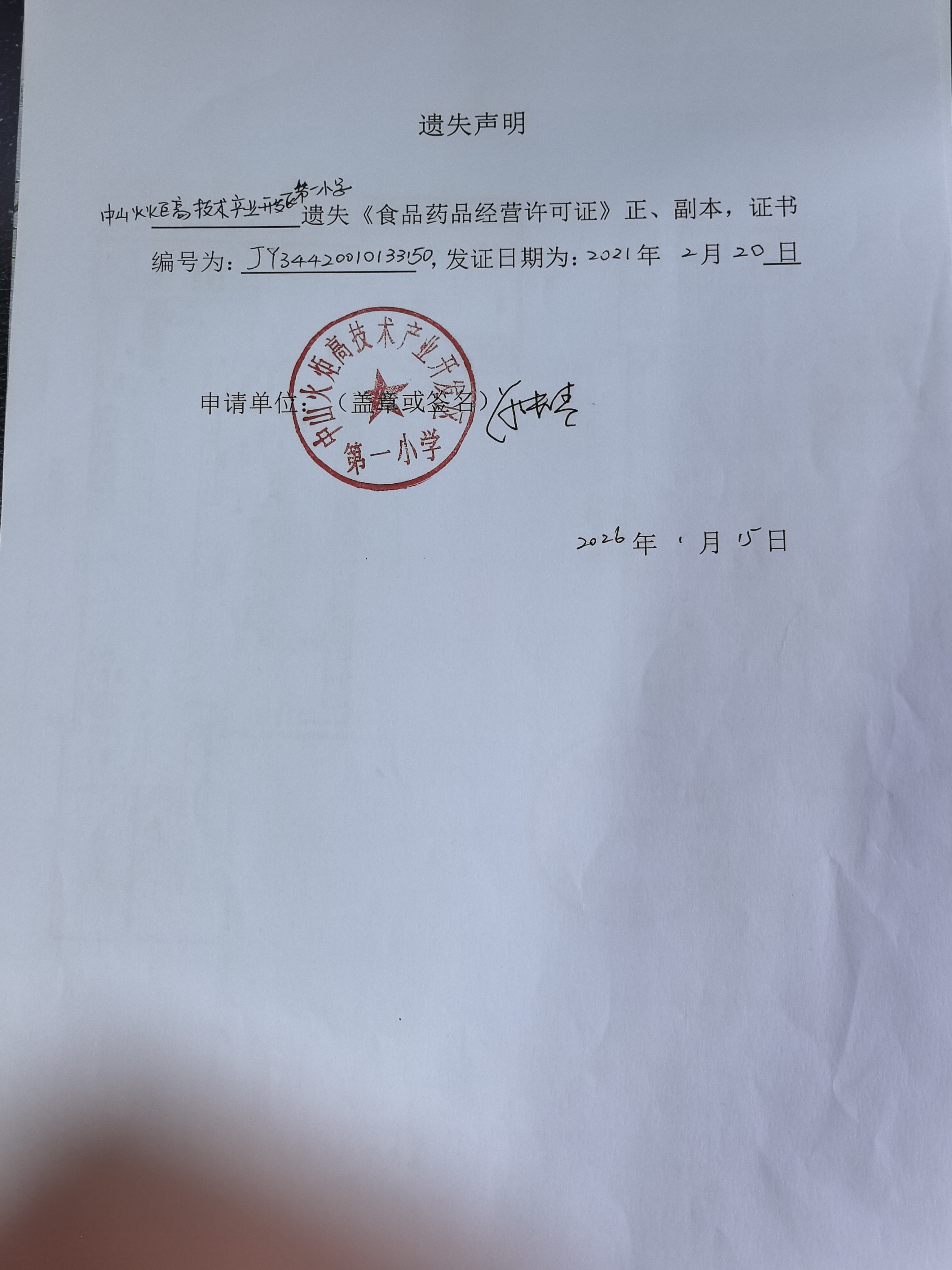 | 名称: | 食品药品经营许可证遗失声明〔中山火炬高技术产业开发区第一小学、中山火炬开发区双明包子店、中山市穆源宫餐饮服务有限公司、中山市郁日良餐饮店(个体工商户)、中山智华医疗研究有限公司〕 | ||