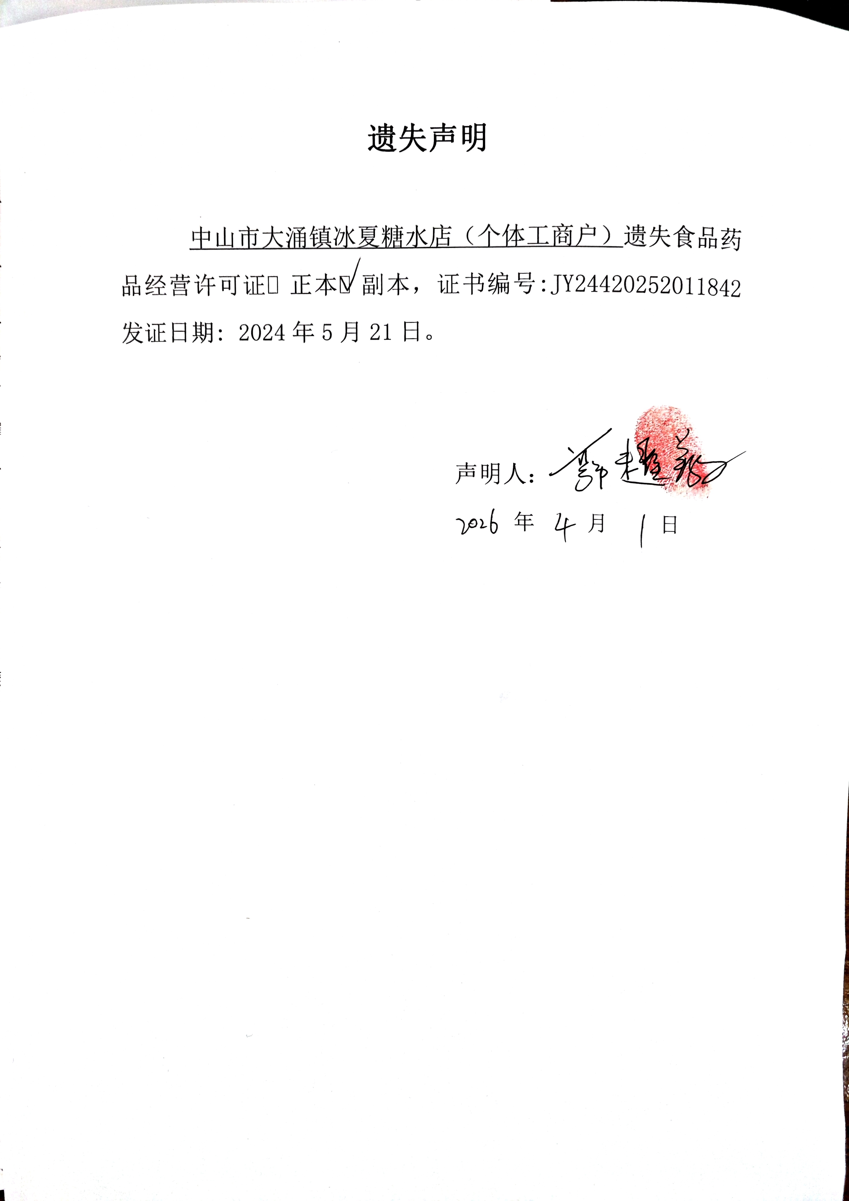 | 名称: | 食品药品经营许可证遗失声明〔中山市大涌镇冰夏糖水店(个体工商户)〕 | ||