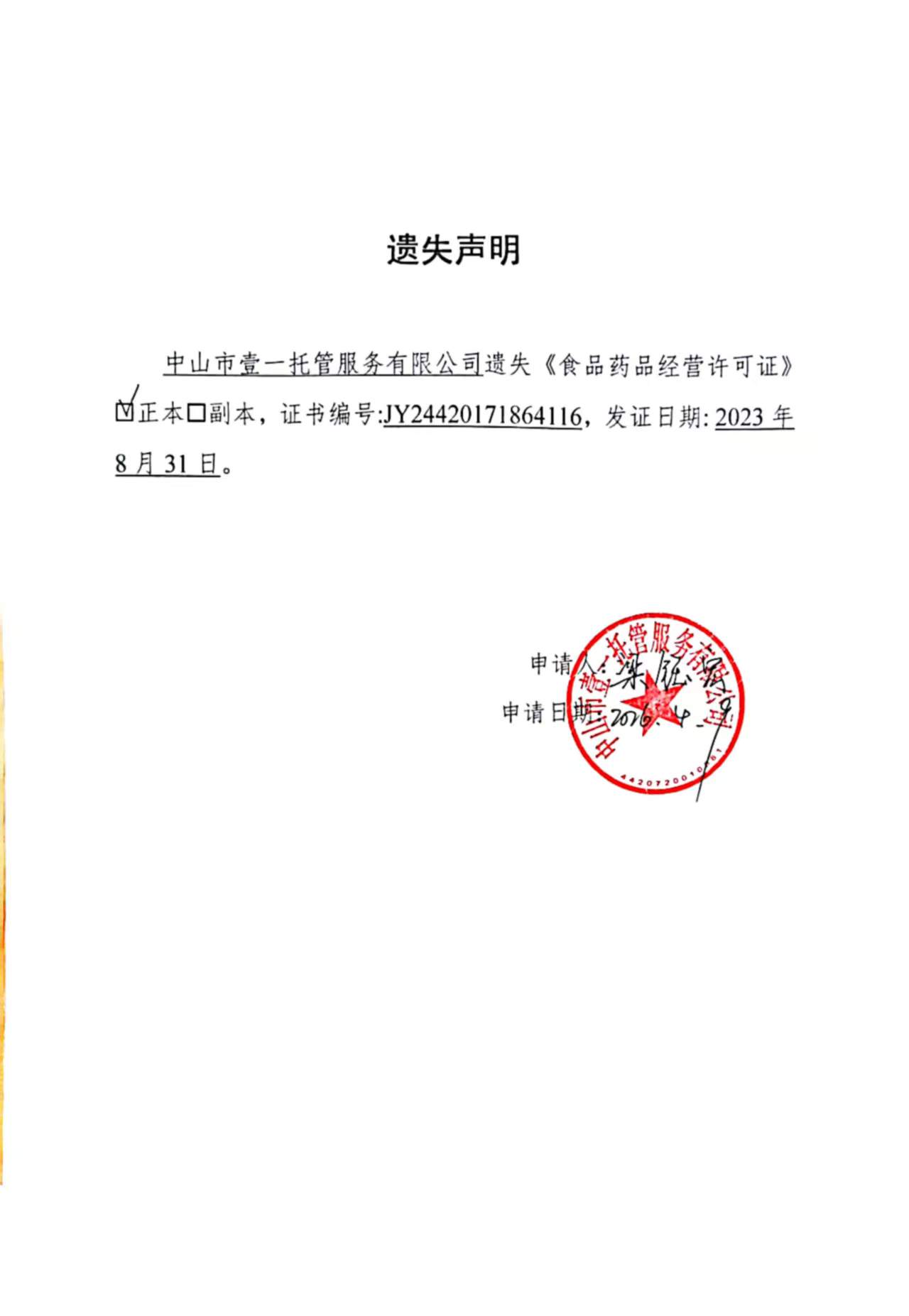 | 名称: | 食品药品经营许可证遗失声明(中山市壹一托管服务有限公司) | ||
